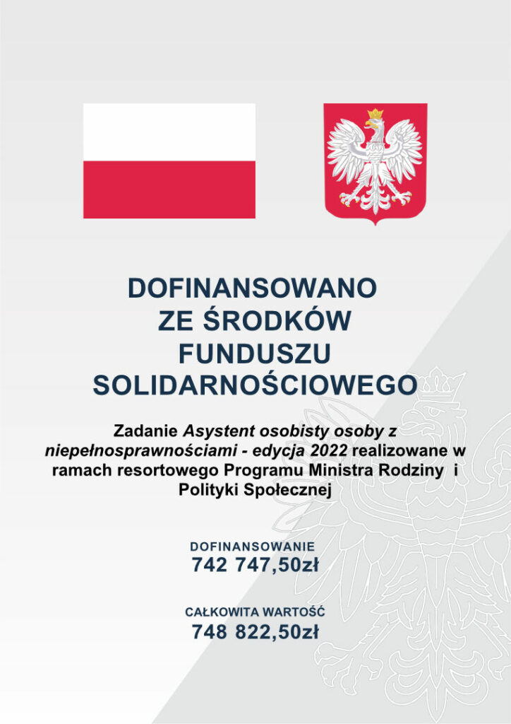 Task Personal assistant for people with disabilities - 2022 edition implemented as part of the Ministry of Family and Social Policy Program "Personal assistant for people with disabilities" - 2022 edition, financed from the Solidarity Fund.